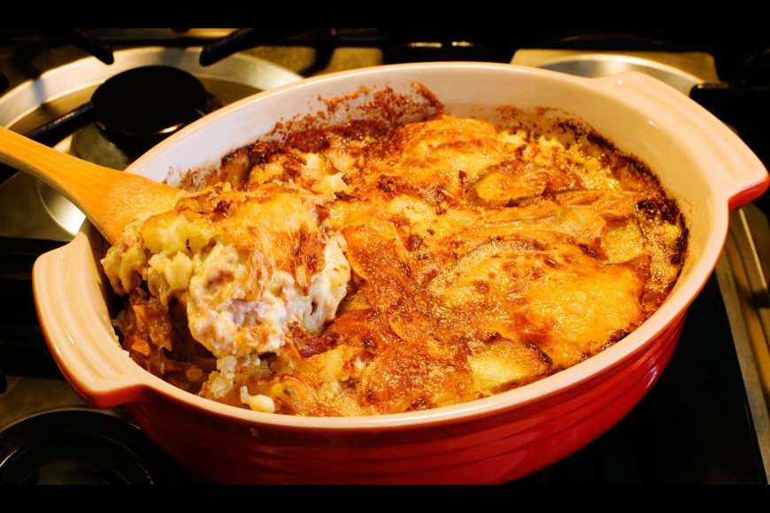 Organiser le plat en trois couches : recouvrir le fond du plat de la moitié des pommes de terre, puis ajouter le mélange oignons et lardons, ajouter enfin par dessus le reste des pommes de terre.